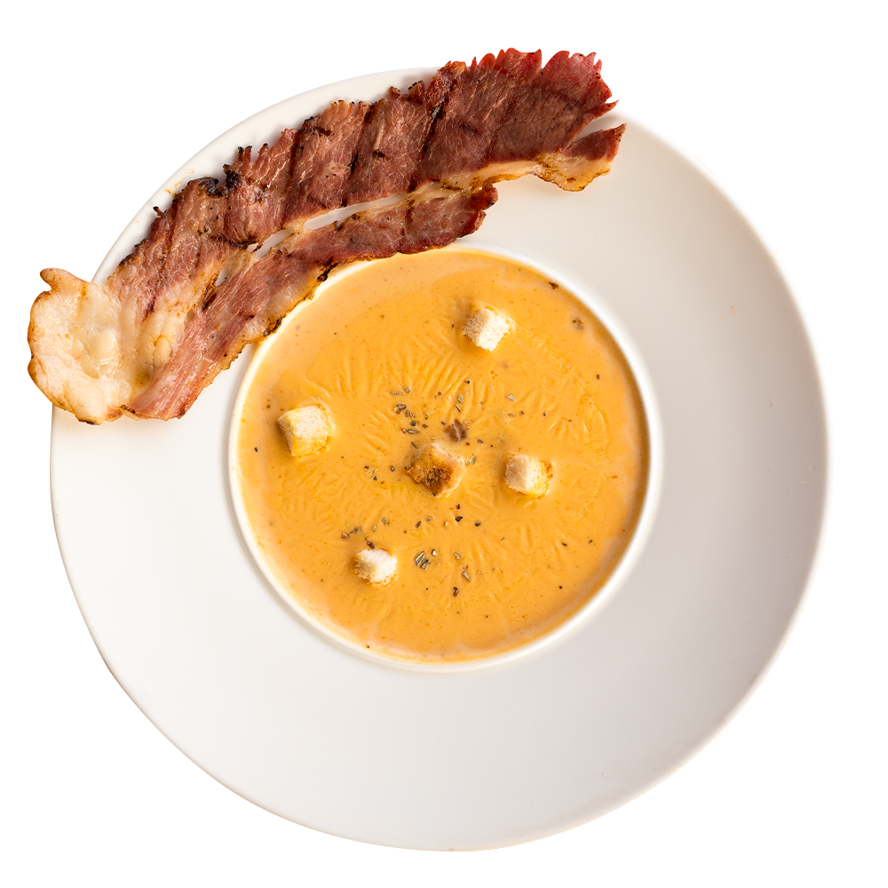 Slow Simmered golden soup of Cheese & Beef Bacon topped with Croutons and Crispy Bacon.